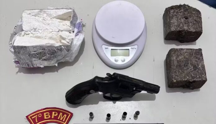 De acordo com a Polícia Militar, equipes do 7º Batalhão realizavam patrulhamento quando foram informadas por moradores sobre a venda de drogas na região. A denúncia indicava que um homem com mandado de prisão em aberto estaria circulando armado no local.