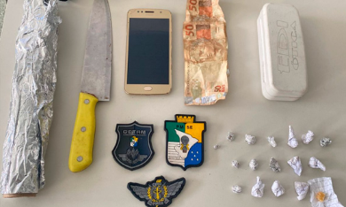 Ao realizarem a averiguação, foram encontrados no interior da bolsa 16 papelotes de substância análoga ao crack, a quantia de R$ 100 em dinheiro, uma faca do tipo peixeira, um aparelho celular e papel alumínio.